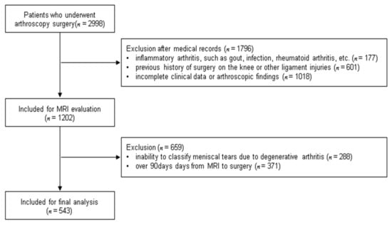 This was a retrospective cohort study of 2998 patients who had undergone arthroscopic surgery between November 2005 and August 2018. The indications for arthroscopy were medial or lateral meniscal tears with/without ACL rupture on MRI. Confirmative diagnosis of meniscal lesions were made using the arthroscopic findings according to the location and classification of the International Society of Arthroscopy, Knee Surgery, and Orthopedic Sports Medicine (ISAKOS) [14]. The ACL rupture was assessed by MRI findings, clinical examination, stress radiography and associated symptoms and functional disability. The exclusion criteria were as follows: (1) Inflammatory arthritis, such as gout, infection, rheumatoid arthritis, etc. (177 patients), (2) previous history of surgery on the knee or other ligament injuries (601 patients), (3) inability to classify meniscal tears due to degenerative arthritis, (288 patients), (4) over 90 days from MRI to surgery (371 patients), and (5) incomplete clinical data or arthroscopic findings (1018 patients with insufficient information about the type and location of meniscus tears). After applying all these criteria, 543 patients (379 male and 164 female) were finally included in this study (Figure 1). The study was approved by the Institutional Review Board at our hospital and was performed in accordance with the ethical standards of the 1964 Declaration of Helsinki.