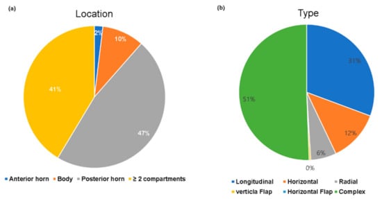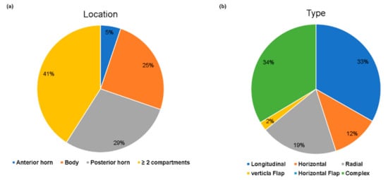 The distribution of medial meniscus tears on arthroscopy. (a) Location of medial meniscus tears. (b) Type of lateral meniscus tears. Complex tear was the most frequently observed type and the posterior horn was the most involved location.
