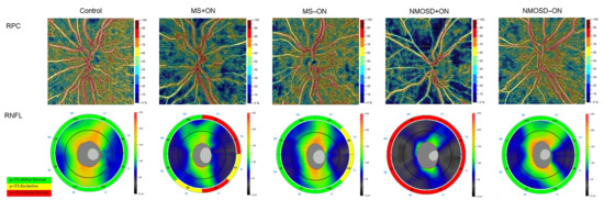 RPC’s vessel density was independently evaluated in MS and NMOSD patients in several studies [10,11,12,13,14]. Spain et al. reported that in MS patients, the RPC density was significantly reduced in ON (MS+ON) and non-ON (MS−ON) eyes compared with controls, but in the study of Wang et al., the RPC of MS−ON eyes did not differ from healthy eyes. However, both studies showed that the MS+ON group had lower RPC than the MS−ON group [11,12]. Regarding the NMOSD patients, the studies were consistent in their findings that the peripapillary vessel density was significantly decreased in NMOSD+ON and NMOSD−ON groups compared with controls and in NMOSD+ON compared with NMOSD−ON [13,14]. However, a comparative analysis of RPC in MS and NMOSD eyes has not been reported so far.