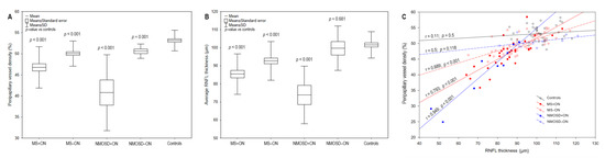 A strong positive correlation was found between radial peripapillary vessel density and RNFL thickness in MS+ON (r = 0.793, p < 0.001), MS−ON (r = 0.689, p < 0.001), and NMOSD+ON (r = 0.949, p < 0.001) groups (Figure 2C).