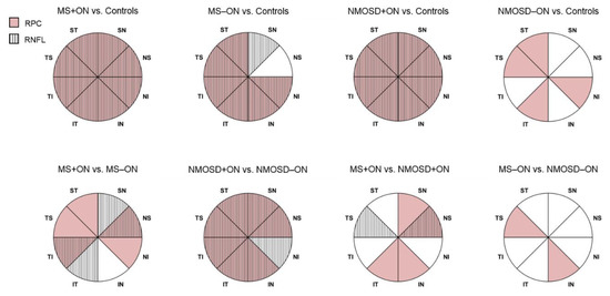 Comparison of the sectoral RPC vessel density and RNFL thickness. The color- and pattern-coded sectors illustrate the significant differences (p < 0.05) of the corresponding RPC (pink) and RNFL (lines) between patients and controls (top row) and between selected groups (bottom row). The exact p-values are presented in Table 3 and Table 4. IN = inferior nasal; IT = inferior temporal; MS = multiple sclerosis; NI = nasal inferior; NMOSD = neuromyelitis optica spectrum disorder; NS = nasal superior; ON = optic neuritis; RNFL = retinal nerve fiber layer; RPC = radial peripapillary capillaries; SN = superior nasal; ST = superior temporal; TI = temporal inferior; TS = temporal superior.