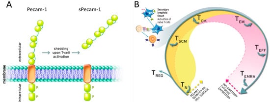 Shedding mechanism of Pecam-1 and its status in adaptive immunity. (A) The immunologically reactive molecule Pecam-1 is shed from the T-cell surface upon activation of immune cells. (B) Availability of Pecam-1 is restricted to early phases of T-cell development. Upon antigen presentation by an antigen presenting cell (APC), sPecam-1 is shed from the T-cell’s surface. The molecule’s decreasing quantity on the cell surface is illustrated by the yellow curve progression. Concomitantly but inversely, the expression of pro-inflammatory cytokines by the T-cells in various differentiation stages are rising as illustrated by the pale red curve progression. P: potential phosphorylation site, APC: antigen presenting cell, TN: naïve T-cell, TREG: regulatory T-cell, TSCN: stem central memory T-cell, TCM: central memory T-cell, TEM: effector memory T-cell, TEFF: effector T-cell, TEMRA: terminally differentiated effector memory RA T-cell.