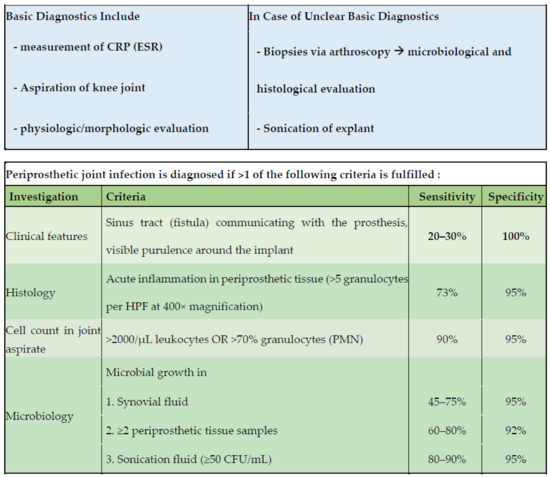 To date, the diagnosis of PJI is still based on various examinations, taking into account individual serum CRP levels, synovial leucocyte counts, and potential microbial identifications of bacterial pathogens, as well as histopathological examinations [3,6,7]. While the existing PJI criteria systems lead to fair results, the diagnostic of persistent low-grade infections are insufficient, calling for the development of highly sensitive tools for early detection. Despite established evaluations of serum inflammatory markers, synovial fluid analysis can be seen as the diagnostic mainstay [8]. Within the current literature, many studies focus on new biomarkers for a reliable detection of PJI [2,9,10]. Nevertheless, there is no single diagnostic tool with sufficient sensitivity and specificity.