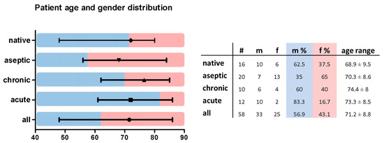 A total of 58 patients were included in this study. Of these, 16 patients were scheduled for primary TKA, 20 patients underwent aseptic revision surgery, and 22 patients had to undergo surgery due to chronic or acute PJI. Of the analyzed patients, 33 were male and 25 were female, with an overall average age of 71.2 ± 8.8 years. The analyzed groups did not show significant differences in age distribution (Figure 3).