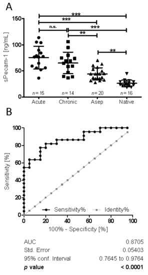sPecam-1 quantification in samples from native, aseptic vs. septic (chronic vs. acute) revision surgeries. (A) Synovia samples were screened for their sPecam-1 content via Elisa, revealing significant differences between the groups according to their categorization to “septic (acute)”, “septic (chronic)”, “aseptic”, and “native”. We examined whether the marker differentiates between chronic and acute PJI. It was shown that the sPecam-1 quantities were not significantly different between chronic and acute PJI, but significantly higher for both groups compared to the aseptic, as well as to the native cohort. ***: p < 0.001 (very significant), **: p from 0.001 to 0.01 (very significant), n.s.: not significant (B) sPecam-1 as biomarker indicating PJI; ROC analysis with 95% confidence intervals was performed.