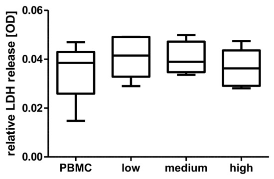 The cytosolic enzyme lactate dehydrogenase (LDH) is released into the cell culture medium upon damage to the plasma membrane and can hence function as a marker for cytotoxicity of a tested substance. LDH assays were performed to preclude potential cytotoxic effects of s-Pecam-1 in different physiological quantities, corresponding to the median calculated from native, septic, and aseptic patients as measured via ELISA (native as in low sPecam-1 = 26 ng/mL, aseptic as in medium sPecam-1 = 44 ng/mL, septic as in high sPecam-1 = 73 ng/mL). Primary isolated peripheral blood mononuclear cells (PBMCs) of five healthy donors were cultivated with and without additional synthetic sPecam-1 for 24h under physiological conditions. The relative LDH release of the PBMCs was determined via optical density (OD), and interpreted after subtraction of the OD of blank medium.