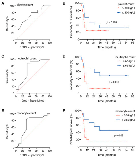 Regarding the preoperative platelet count, the optimal cutoff value was 300 g/L, and the AUC was 0.734 (95% CI 0.553–0.915, p = 0.033), with a sensitivity of 61% and a specificity of 75% (Figure 2A). Median OS was higher in the group with low initial platelet count (≤300 g/L; 15 months, 95% CI 0.0–30.6) compared to patients with initial high platelet count (>300 g/L; 5 months, 95% CI 2.6–7.4), without reaching a statistically significant difference (p = 0.169, Figure 2B).