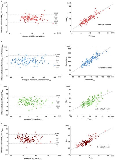 The main findings of this retrospective analysis are as follows: (i) good agreement of D-shaped MA dimensions was observed between MDCT and 3D TEE; (ii) MAA, perimeter, and SL distance measured by MDCT were significantly larger compared to those by 3D TEE, whereas the TT distance was comparable between the two modalities.