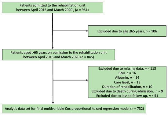 Of the 951 patients admitted to the rehabilitation unit, 845 patients were aged >65 years. After excluding 113 patients with missing data, 732 participants were finally evaluated. The patient inclusion flowchart is shown in Figure 1.