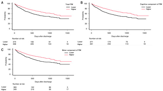 Kaplan–Meier curves showing the probability of non-readmission after discharge. Graphs are presented for total FIM (A) and cognitive (B) and motor (C) components of FIM.