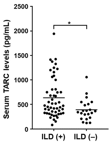 In recent years, TARC has also been implicated in interstitial lung disease (ILD), a common and severe complication of SSc. ILD is a group of inflammatory and fibrotic lung diseases with different etiologies such as infection, malignancy, drug-induced, and connective tissue diseases [23,24]. Yamane et al. have shown that serum TARC levels are elevated in patients with non-small cell lung cancer associated with ILD compared with patients without ILD [25]. They have also reported that TARC is a potential diagnostic marker for drug-induced ILD in the treatment of malignant lymphoma [26]. In the context of ILD caused by connective tissue diseases, serum TARC levels are increased in patients with dermatomyositis-associated ILD [27].