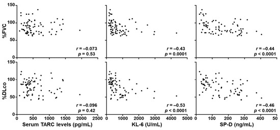Subsequently, we analyzed the correlation between serum TARC levels and pulmonary function in the whole SSc patients. Serum TARC levels did not correlate with %FVC (r = −0.0733, p = 0.535) or %DLco (r = −0.0959, p = 0.416; Figure 3). We also examined the correlation of serum levels of KL-6 and surfactant protein-D (SP-D), the conventional biomarker for SSc-ILD [37,38,39,40,41], with pulmonary function. Both KL-6 and SP-D showed significant negative correlation with %FVC (r = −0.430, p = 0.0001 for KL-6, r = −0.531, p < 0.0001 for SP-D) and %DLco (r = −0.438, p < 0.0001 for KL-6, r = −0.456, p < 0.0001 for SP-D). These results suggest that serum TARC levels are not associated with the severity of SSc-ILD. Because Th2 immune responses has been implicated in SSc-ILD [29,30], we also measured serum IL-13 levels in the same SSc patient group. However, these was no significant correlation between serum levels of TARC and IL-13 in SSc patients (r = 0.153, p = 0.192 Figure S1). Together with the lack of correlation between serum TARC levels and the severity of SSc-ILD, this result suggests that serum TARC levels in SSc patients might not necessarily reflect Th2 immune responses nor their contribution to SSc-ILD.
