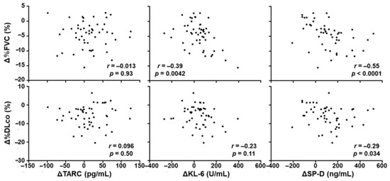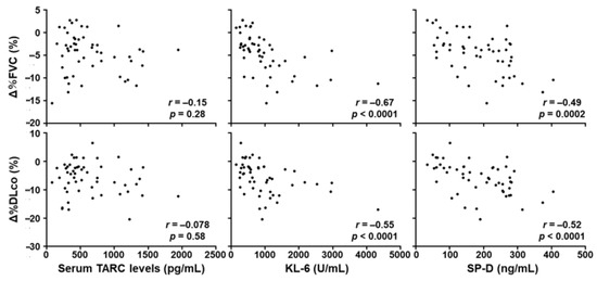Correlations between the changes of serum TARC, KL-6, and SP-D levels and the changes of pulmonary function during the follow-up period. Correlations between the changes of serum TARC, KL-6, and SP-D levels and the changes of %FVC and %DLco during the follow-up period in SSc patients with SSc-ILD at their first visit (n = 52). Correlations were assessed by Spearman’s rank correlation test.
