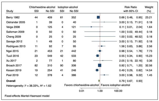 The objective of this systematic review and meta-analysis was to determine the comparative effectiveness of alcohol-based chlorhexidine and alcohol-based iodophor as surgical site skin preparation agents to prevent SSIs based on data from randomized controlled trials. A secondary objective was to determine if the effectiveness of alcohol-based agents differs between different surgical procedure types.