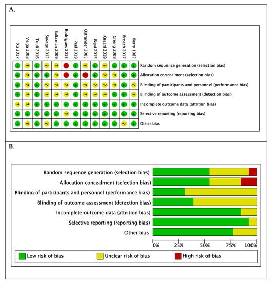 - Higgins, J.P.; Altman, D.G.; Gøtzsche, P.C.; Jüni, P.; Moher, D.; Oxman, A.D.; Savović, J.; Schulz, K.F.; Weeks, L.; Sterne, J.A. The Cochrane Collaboration’s tool for assessing risk of bias in randomised trials. BMJ 2011, 343, d5928. [Google Scholar] [CrossRef]