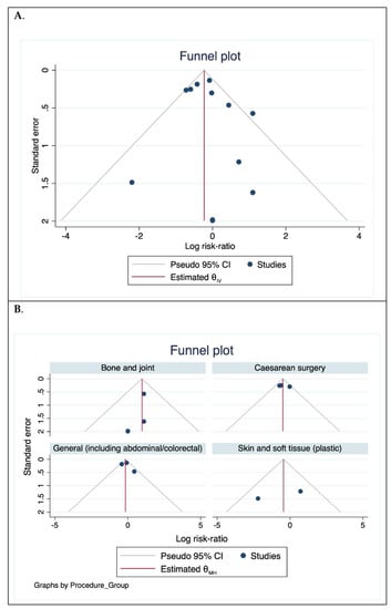 The risk of bias was assessed as low in two studies [23,27] (Figure 4A). In nine trials, the risk of bias was unclear, particularly the risk of performance and detection bias [17,18,19,20,21,25,26,28,29]. There was high risk of selection bias determined in the trials by Rodrigues et al. [24] and Ostrander et al. [22] (Figure 4A). Overall, the risk of reporting bias and attrition bias was low (Figure 4B). Excluding the trials with high risk of bias did not alter the overall estimates (n = 11 trials, RR 0.765; 95% CI 0.646, 0.907; p = 0.0020: I2 = 39.72% (95% CI 0 to 70.3)), however, on sub-group analysis of different procedure groups, when the trial by Ostrander et al. was excluded, chlorhexidine-alcohol preparation for bone and joint surgery was no longer statistically significant (RR 2.636; 95% CI 0.995, 6.983; I2 = 0.00% (95% CI 0 to 66.1)).
