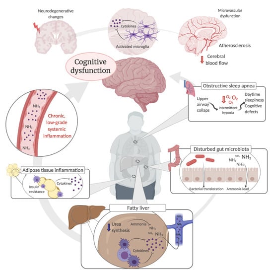 The metabolic syndrome is defined by the presence of abdominal obesity, peripheral insulin resistance, hypertension and dyslipidaemia [20]. Several features of the metabolic syndrome, i.e., systemic inflammation, vascular dysfunction, atherosclerosis and obstructive sleep apnoea (OSA), have frequently been linked to cognitive disturbances, which has given rise to the concept of the metabolic cognitive syndrome [21]. These are all features also linked with NAFLD [22,23], but it is unclear if NAFLD in itself gives rise to and contributes to cognitive dysfunction. Adding to these features, NAFLD exhibits disruption of the gut microbiota and impairment of urea synthesis in the liver, leading to ammonia accumulation even in precirrhotic stages [24,25]. These disturbances, compounded by systemic inflammation, are central elements of the gut–liver–brain axis and acknowledged as significant in the pathogenesis of hepatic encephalopathy (HE), the neuropsychiatric syndrome associated with progressive liver injury [26,27,28,29].