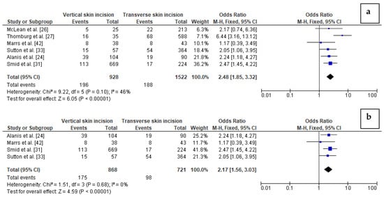 | McLean et al., 2011 [26] | 1998–2005 | USA | Retrospective cohort study | 242 | Incomplete medical reports | BMI ≥ 30 kg/m2 at delivery | Type of skin incision and partial or complete wound separation |