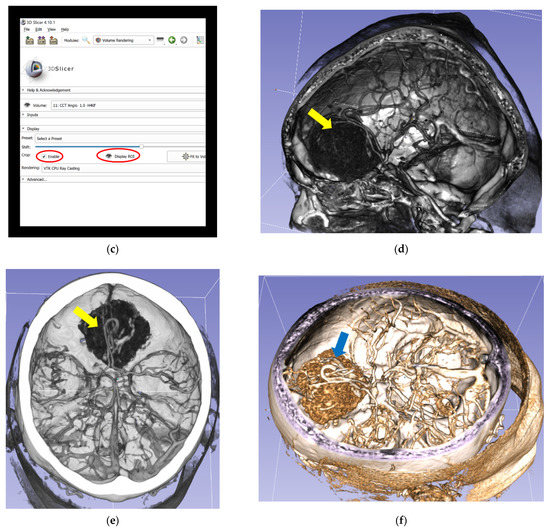 Reconstruction process of 3D-VR images from 2D-CT modalities (including CTA) and completion of the final VR scene in the 3D Slicer. (a) Import of original CT and CTA data in an anonymized DICOM format into 3D Slicer software to create a patient-specific database and selection of “CCT Angio-Default” (blue arrow) in the volume rendering window (red circled). (b) Performance of 3D-VR reconstruction of a skull (yellow arrow) in the volume rendering window. (c) Activation of the ROI function (red circled), which enables visualization of the meningioma and relevant vascular anatomy from different perspectives by partial omission of skull bones. (d) Lateral aspect of the meningioma (yellow arrow) and relevant vascular anatomy, simplified by using the ROI function. (e) Superior aspect of the meningioma (yellow arrow). (f) Superior lateral aspect of the meningioma (blue arrow) with different color displays. 2D, two-dimensional; 3D, three-dimensional; CT, computed tomography; CCT, cranial computed tomography; CTA, computed tomography angiography; DICOM, digital imaging and communications in medicine; ROI, regions of interest; VR, virtual reality.