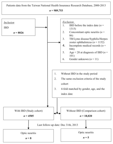 All included patients were at least 20 years old at diagnosis of IBD, had records of outpatient or inpatient visits with a diagnosis of IBD at least 3 times during the study period and not limited to the main diagnosis. Patients with tuberculosis, Lyme disease, syphilis and Herpes zoster ophthalmicus from before 1 year to after 1 year of the index date were excluded. In addition, patients who were documented as having IBD before 1 January 2000 or had incomplete medical records, defined as the insurance status being incomplete or the given codes unrelated or incorrect, were also excluded. A group of patients who were four-fold matched with the IBD group was selected as the control, using age (each 5-year span), sex and year of the index date for matching. Patients were followed until the incidence of ON in the records of outpatient or inpatient visits, or until the end of the study period (31 December 2013). Figure 1 shows a flowchart of the patient selection.