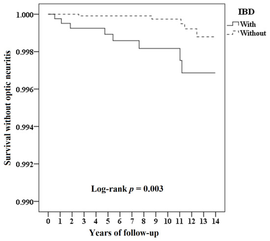 At the study conclusion, eight (0.18%) and five (0.003%) patients had developed ON in the patients with and without IBD groups, respectively, with a significant difference in prevalence shown between the two groups (p = 0.001). The mean time for ON to develop for patients with IBD was 5.43 ± 4.23 years and 9.24 ± 3.98 years for patients without IBD. Results of the Kaplan–Meier analysis for the cumulative risk of developing ON in patients with IBD and patients without IBD are shown in Figure 2. Patients with IBD had significantly higher odds of developing ON compared to patients without IBD, with log-rank test p = 0.003. Differences in risk between the two groups were significant in each year of the total 14 years of follow-up (all p < 0.016). Adjusted HRs showed that patients with IBD aged between 30 and 39 years, with comorbidities including NMO, ADEM and SLE, and with a higher CCI had a significantly higher risk of developing optic neuritis (Table 2).