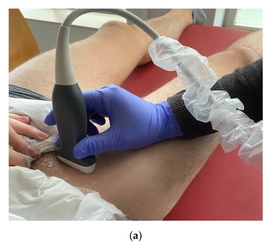 The peripheral nerve selected was the femoral, located over the femoral triangle with an Alpinion Ecube i8 ultrasound equipment and an E8-PB-L3-12T 3-12MHz linear probe in a transverse section (Figure 1a). After cleaning the skin with chlorhexidine (Lainco® 2%), the needle was emplaced using an in-plane approach, with a 45° angle to the skin surface, until reaching the epineurium of the femoral nerve at its lower and lateral aspect (Figure 1b). The axonal topography of the femoral nerve refers to this site as the best part of the nerve to locate the motor axons of the quadriceps muscle [19]. The intervention was applied bilaterally to both lower extremities.