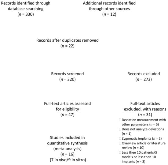 The electronic search yielded 320 hits, which were supplemented by 12 publications from the manual search. After screening the titles and then the abstracts, 47 publications were viewed as full texts. The review of the full texts led to the exclusion of a further 31 publications for the following reasons: deviation measurement with other parameters [22,28,29,30], does not analyze all deviations [31], zygomatic implants [32,33], different research question [17,34,35,36,37,38,39,40,41], overview article or literature review [1,11,24,42,43,44,45,46,47,48], and less then 10 patients/five models or less then 10 implants [23,49,50]. The inclusion criteria were met in nine publications of in vitro studies (Table 2) [20,21,51,52,53,54,55,56,57]. Clinical data could be used from seven publications that met the inclusion criteria (Table 3) [58,59,60,61,62,63,64].