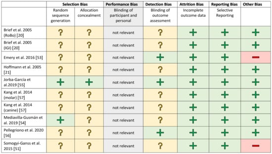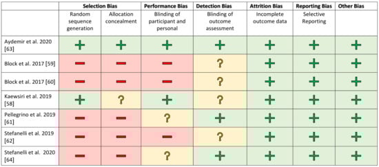 A blinded assessment was clearly described in only a few studies [58,63]. In the other works, this was recorded as an increased risk factor. All studies showed a low risk rating for attrition and reporting bias. The financial participation of an industrial partner was assessed as a further possible risk factor [51,53]. There was no evidence of financial support for the other studies.