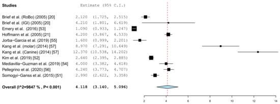 The results of this meta-analysis are in the range of the results obtained from meta-analyses for static navigation [10,65,67]. Further investigations must show whether this also applies to dynamic navigation systems that have not been investigated so far. There are also only studies by one working group of individual systems. Therefore, there are no statements about the robustness of the values when the systems are used by different surgeons. In particular, in addition to the accuracy, the feasibility in everyday clinical practice must also be examined in further studies. The parameters to be considered here are the time required, the surgical difficulty in use, and, last but not least, the costs.