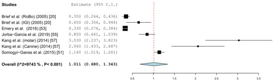 The results of the meta-analysis showed comparable mean values. The global deviation in the clinical studies was 1.33 mm (95% CI, 0.98–1.68). In the in vitro studies, this global deviation was 1.04 mm (95% CI, 0.76–1.33). The forest plots demonstrate that the accuracy was highly system-dependent. Both evaluation groups showed outliers for the mean accuracy. It can also be seen from the graph that the scatter around the mean values in the clinical examinations is higher.