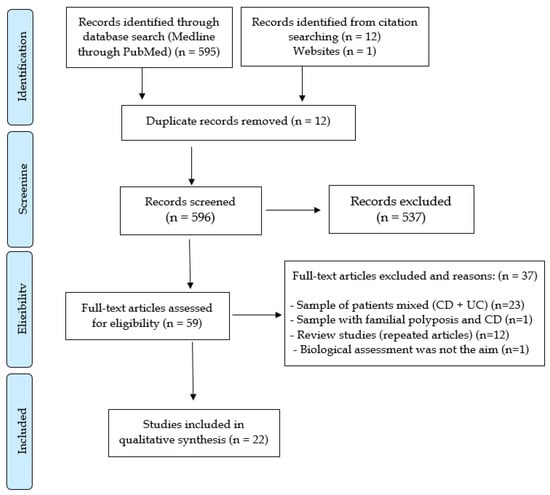 Five hundred and ninety-five files were initially selected from the PubMed database. Another 13 relevant articles were retrieved from other sources, with a total of 608 references initially considered for screening. From those, 12 articles were excluded because they were considered duplicates, 537 because they were studies with different outcomes than those proposed for the review, 23 for samples with IBD patients, mixing UC and CD patients, one for containing patients with familial adenomatous polyposis and CD in the same sample, 12 for being reviews based on the same studies already surveyed, and one because of the assessment of biologicals was neither in the objective nor in the conclusions of the study. In the filtering, there were 22 articles left that were used in the qualitative analysis. Figure 1 summarizes the study selection process according to the PRISMA flowchart.