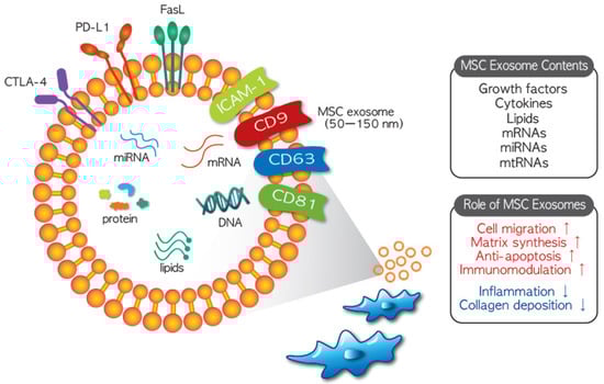 Composition and therapeutic function of MSC (mesenchymal stem cells) exosomes. Exosomes derived from MSCs may contain growth factors, cytokines, DNA, lipids, mRNAs, miRNAs, and mtRNAs. Similar as their cells from which they originated, MSC exosomes possess therapeutic properties including stimulation of cell migration and extracellular matrix synthesis, anti-apoptotic effects, immunomodulation and anti-inflammatory effects, and stimulation of collagen deposition. Due to these distinctive therapeutic features, the feasibility of MSC exosome therapy is currently being assessed in several clinical studies.