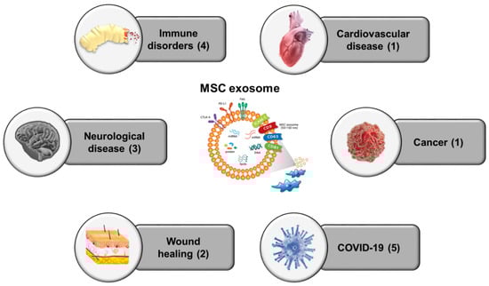 Several clinical features of MSC exosomes have been described in preclinical studies. For example, MSC exosomes accelerate the tissue regeneration process by regulating proliferation and apoptosis of endogenous cells [32,33,34]. MSC exosomes also affect the fate decision of some immune cells, thus facilitating attenuation of excessive inflammation or a return to immune homeostasis [35,36,37]. Furthermore, MSC exosomes induce angiogenesis by stimulating various cellular signaling pathways [38,39,40]. Given these promising results, safety and efficacy of application of MSC exosomes are currently being evaluated in clinical trials targeting various diseases. Below, we review the therapeutic potential of MSC exosomes according to disease type.