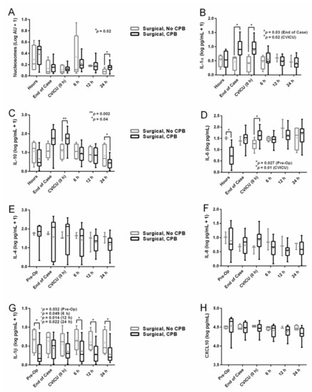 Serum cytokine and nucleosome levels (log-transformed) by group during perioperative period. (A), Circulating nucleosomes (log AU +1); p = 0.02 (24 h). (B), IL-1α (log pg/mL + 1); p = 0.03 (end of case) and p = 0.02 (CVICU). (C), IL-10 (log pg/mL + 1); p = 0.002 (CVICU) and p = 0.04 (24 h). (D), IL-6 (log pg/mL); p = 0.027 (pre-op) and p = 0.01 (CVICU). (E), IL-4 (log pg/mL + 1). (F), IL-8 (log pg/mL + 1). (G), IL-1β (log pg/mL + 1); p = 0.032 (pre-op), p = 0.049 (6 h), p = 0.014 (12 h), and p = 0.022 (24 h). (H), CXCL10 (log pg/mL). Whiskers extend to minimum and maximum values, box represents 25th to 75th percentiles, line indicates median, and + indicates mean. IL = interleukin, AU = arbitrary units, CPB = cardiopulmonary bypass, CVICU = cardiovascular intensive care unit, CXCL10 = C-X-C motif chemokine ligand 10, asterisks denote statistical significance.