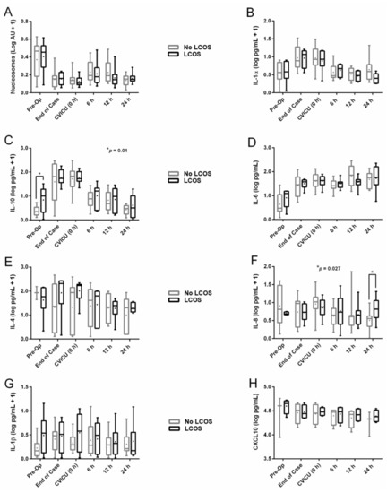In all bypass patients, levels of IL-10 (Figure 3C) spiked from a relatively low level preoperatively to a peak during surgery, followed by a decline to near-baseline levels, irrespective of LCOS status. However, patients developing LCOS were characterized by significantly higher IL-10 levels preoperatively. Levels of IL-8 (Figure 3F) widely varied in all bypass patients during the perioperative period with no identifiable trend. However, by 24 h postoperatively, patients developing LCOS were characterized by significantly higher levels of IL-8. Patients developing LCOS also entered surgery with significantly higher levels of MIP-1α (Figure S4H), a chemokine released by macrophages. Levels of all remaining cytokines, as well as circulating nucleosomes, did not differ by LCOS status during the perioperative period (Figure 3 and Figure S4). In all cases, a significant two-way nucleosome/histone level x time interaction was noted on the primary outcome of LCOS. Non-log transformed values for Figure 3 nucleosomes and cytokines are provided in Figure S5.