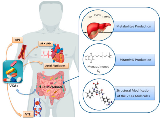 With the establishment of the heart-gut axis concept, several studies suggest an important role of the gut microbiota in the pathogenesis of cardiovascular diseases. However, there are limited studies indicating a direct association between gut microbiota and VKAs. Recently, Miamo et al. collected samples from 200 undergoing heart valve replacement patients and the different responses to warfarin anticoagulation therapy were classified as; low, normal, and high responder. The authors observed that the genus Escherichia-Shigella and the genus Enterococcus were significantly enriched in the low and high response groups, respectively. When the vitamin k content was measured in stool and blood samples, synthesized VK2 and the relative abundance of modules associated with VK biosynthesis and enzymes were higher in the low responder group when compared to normal and high responder [95].