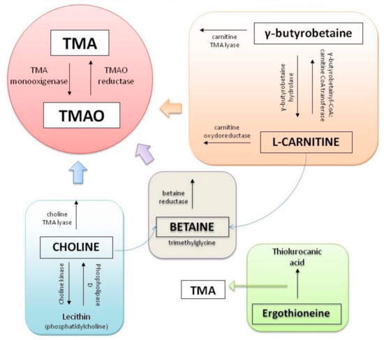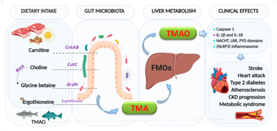 On the other hand, L-carnitine is converted into TMAO by the action of carnitine oxidoreductase. Next, TMA is rapidly oxidized by hepatic flavin-containing monooxygenases (FMO1–FMO3) to form TMAO [47]. Figure 3 summarizes the principal pathways and enzymes involved in the production of TMA and TMAO.