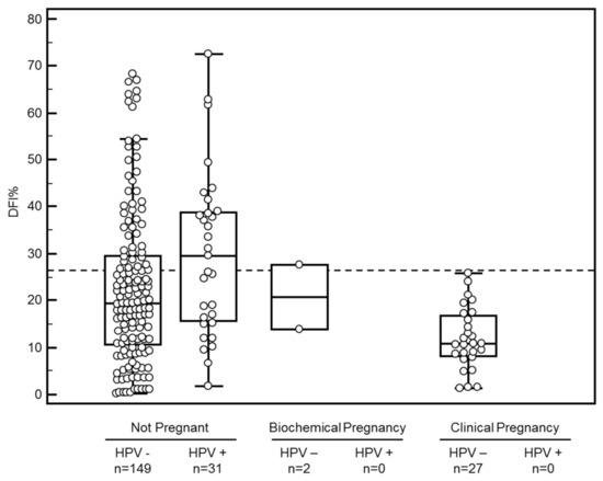 Depuydt, C.; Donders, G.; Verstraete, L.; Beert, J.; Salembier, G.; Bosmans, E.; Dhont, N.; Kerkhofs, C.; Ombelet, W. Negative Impact of Elevated DNA Fragmentation and Human Papillomavirus (HPV) Presence in Sperm on the Outcome of Intra-Uterine Insemination (IUI). J. Clin. Med. 2021, 10, 717. https://doi.org/10.3390/jcm10040717