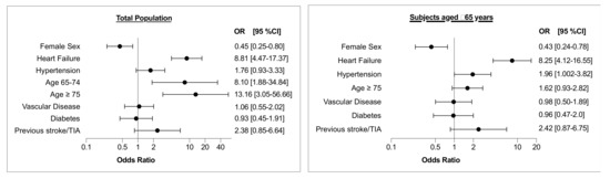 Results of multivariate analysis evaluating the characteristics of study participants with regard to screen-detected AF, as confirmed by 12-lead ECG. Vascular disease includes CAD, previous myocardial infarction and/or peripheral artery disease. Left panel: Total population; Right panel: Subset of subjects aged ≥ 65 years. TIA = transient ischemic attack; OR = odds ratio; CI = confidence interval.