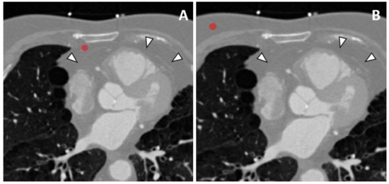 Segmentation of paracardiac (A) and subcutaneous (B) adipose tissue, by placing regions of interest with a diameter of 1 cm which will then be thresholded for fat. The pericardium may be seen as a thin, hyperdense line marked by white arrowheads separating the epicardial (inside) and paracardiac adipose tissue (outside).