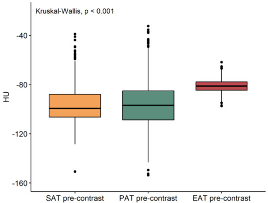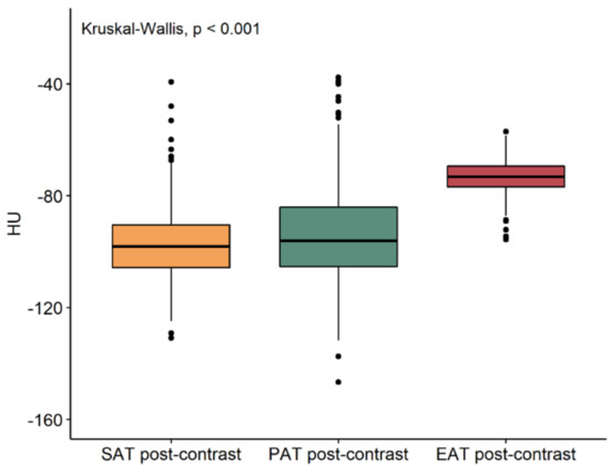 Boxplot of subcutaneous (SAT), paracardiac (PAT), and epicardial (EAT) adipose tissue post-contrast density values. EAT density is significantly greater than SAT and PAT.