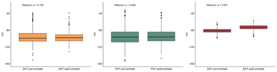 Comparison of subcutaneous (SAT), paracardiac (PAT), and epicardial (EAT) adipose tissue pre- and post-contrast values. EAT density values significantly increased after contrast administration.