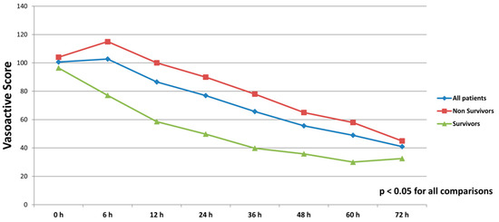 Course of vasoactive score (dobutamine dose (μg/kg/min) + 100 × epinephrine dose (μg/kg/min) + 100 × norepinephrine dose (μg/kg/min)) in all patients, survivors and non-survivors within 72 h after initiation of biventricular support.