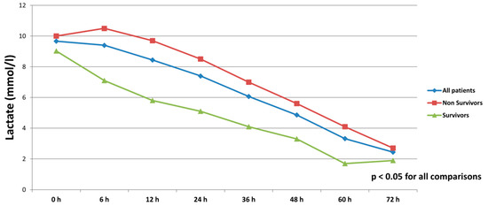 Serum lactate levels in all patients, survivors and non-survivors within 72 h after initiation of biventricular support.