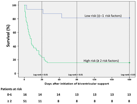 All data were analyzed retrospectively. Data are presented as absolute variables and percentages (%) for categorical variables and either median with interquartile range (IQR: 25th–75th percentile) or mean with standard deviation according to the distribution of the variables. We assessed normality using a Shapiro–Wilk test, as well as a Pearson test. After testing for normal distribution, Student’s t-test or Mann–Whitney test was implemented to test for differences between the various characteristics. For categorical variables Fisher’s exact test or chi-square test were used, as appropriate. In order to establish risk factors for mortality on initiation of biventricular support, a univariate analysis was performed to identify the factors that could be associated with the outcome of mortality. All variables from baseline characteristics through hemodynamic parameters on initiation of biventricular support with a p value of <0.05 were integrated in a multiple regression analysis model in order to identify the independent risk factors of mortality outcome on initiation of biventricular support. For quantitative parameters, we calculated the cut-off level associated with mortality using receiver operating characteristic (ROC) analysis.