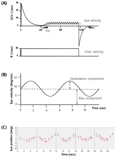 The OVAR test (I-Portal® Neuro-Otologic Test Center; Neuro Kinetics Inc., Pittsburgh, PA, USA) was performed in all participants in this study. Following step velocity stimulation in the earth vertical axis (40 s; 60°/s), the chair was tilted to 20° after disappearance of the horizontal VOR. The tilt position was maintained for six cycles with CW or CCW rotations.