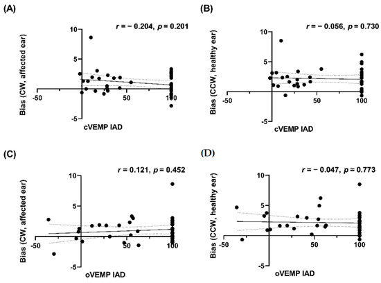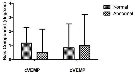 Data analyses were conducted using IBM SPSS Statistics for Windows software (version 21.0; IBM Corp., Armonk, NY, USA). ANOVAs were used to compare the means of three variables. For bivariate comparison, the Mann–Whitney U test was used for continuous variables. To compare the values of OVAR and VEMP directly, Pearson correlation analysis was used. All reported p-values were two-sided, and p < 0.05 was considered statistically significant.