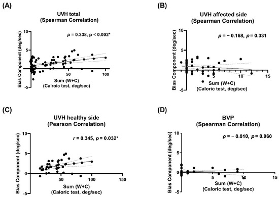 Figure 6C). BIC was correlated with caloric responses with statistical significance, especially in healthy side and combined analysis (