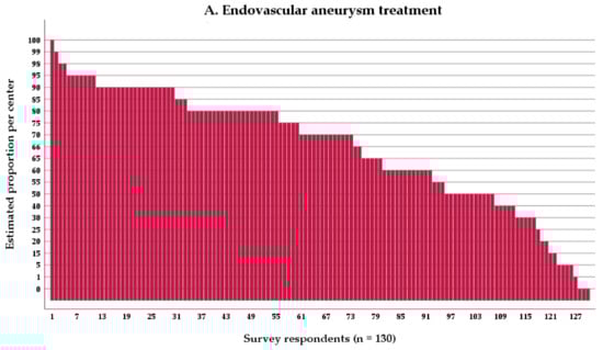 Overall, survey respondents indicated that a mean estimated 65% of all treated ruptured aneurysms were treated endovascularly. In addition, a mean estimated 65% of treated aneurysms were treated within 24 h of symptom onset, whereas a mean estimated 18% were treated within 24–48 h, a mean estimated 8% were treated within 48–72 h, and a mean estimated 9% of aneurysms were unaccounted for (Table 2, Figure 2A–D). It is unknown if the latter 9% accounts for aneurysms treated later than 72 h, not treated at all, or a combination of both.