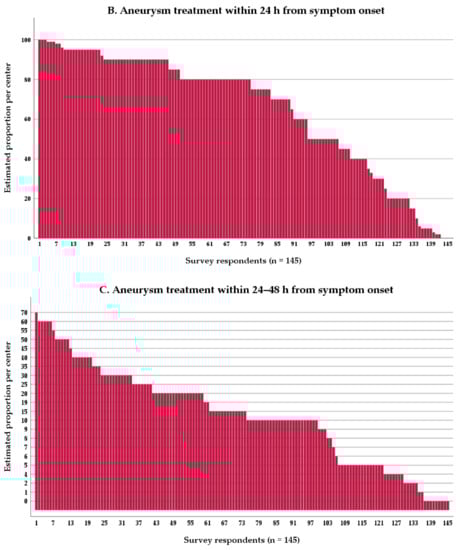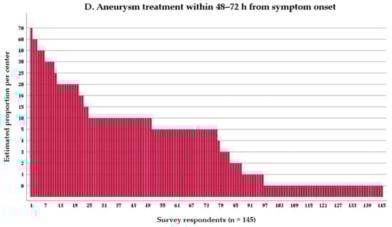 Ninety-six centers (66%) reported treating the majority (e.g., >50%) of aneurysms within 24 h (Figure 2B). Seven centers (5%) treat the majority of aneurysms between 24–48 h (Figure 2C), and only three (2%) 48–72 h after onset (Figure 2D). Thirty-nine centers (27%) do not treat the majority of aneurysms in any particular time window.